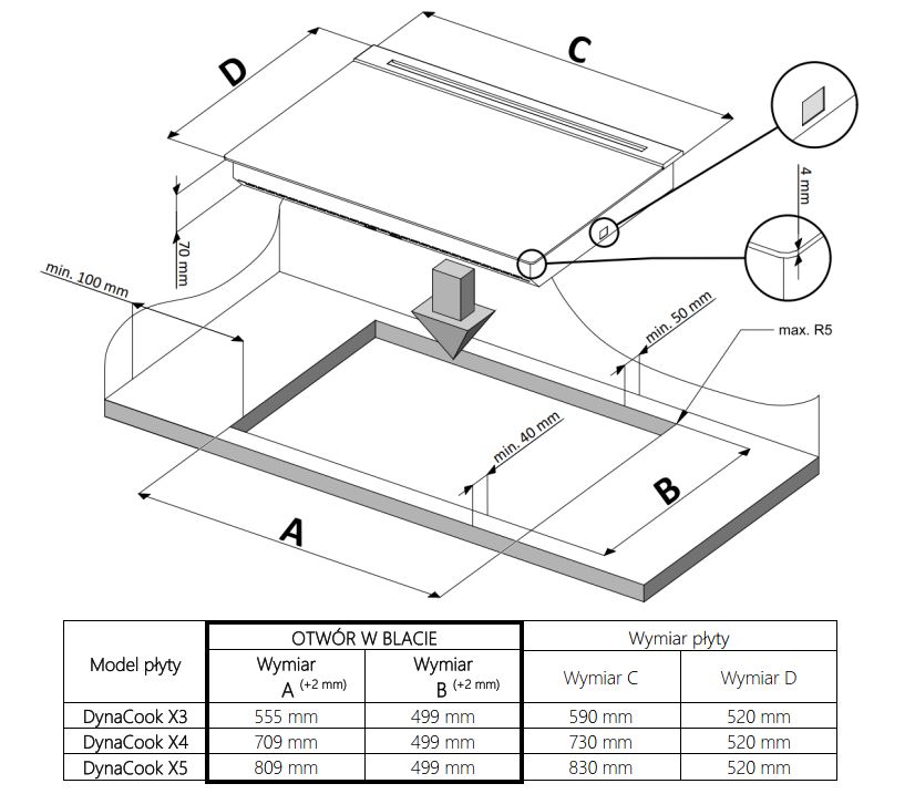 - Powierzchnia płyty: szkło ceramiczne z aluminium anodowanym na czarno (opcjonalnie szczotkowana stal nierdzewna)